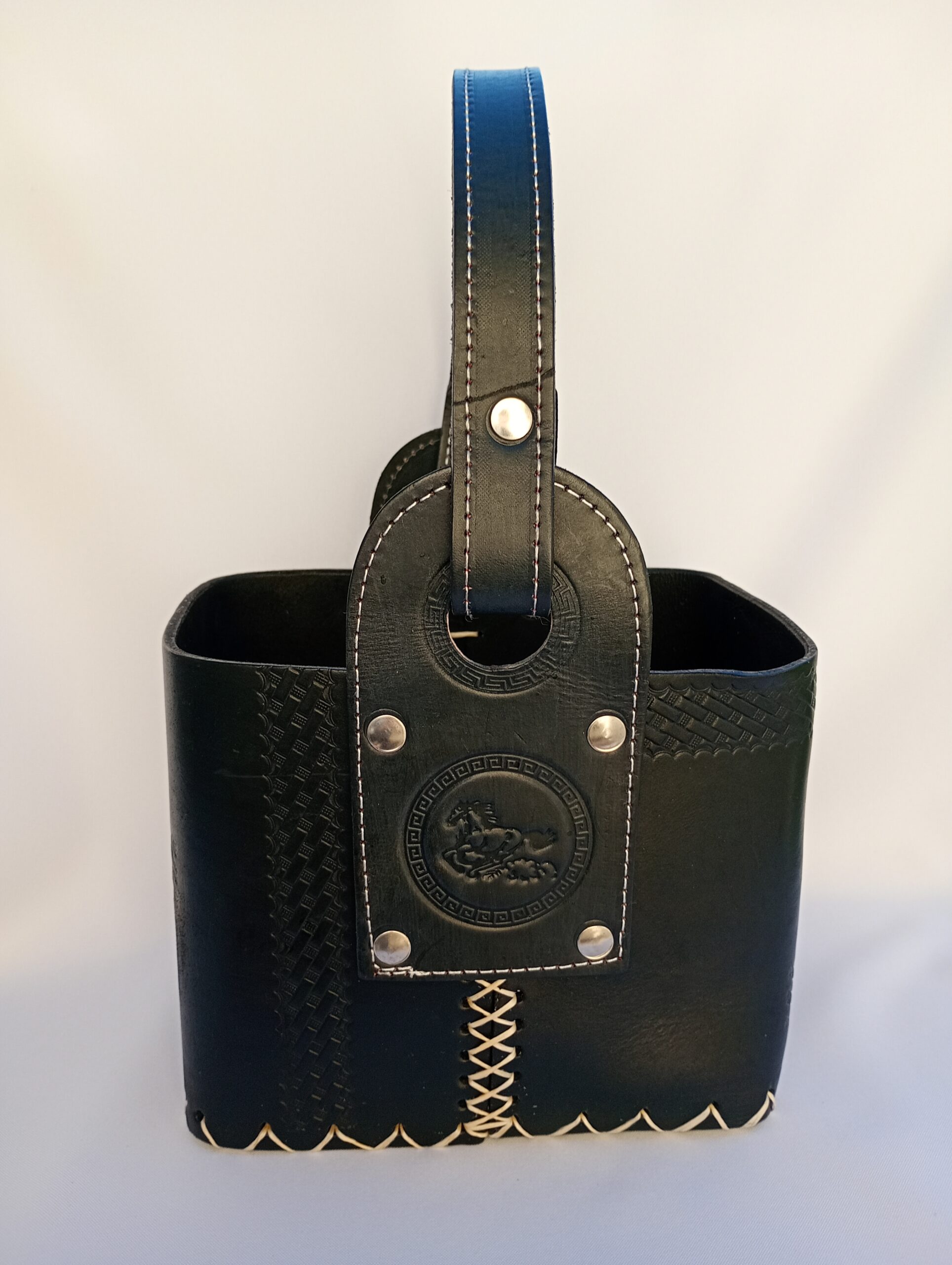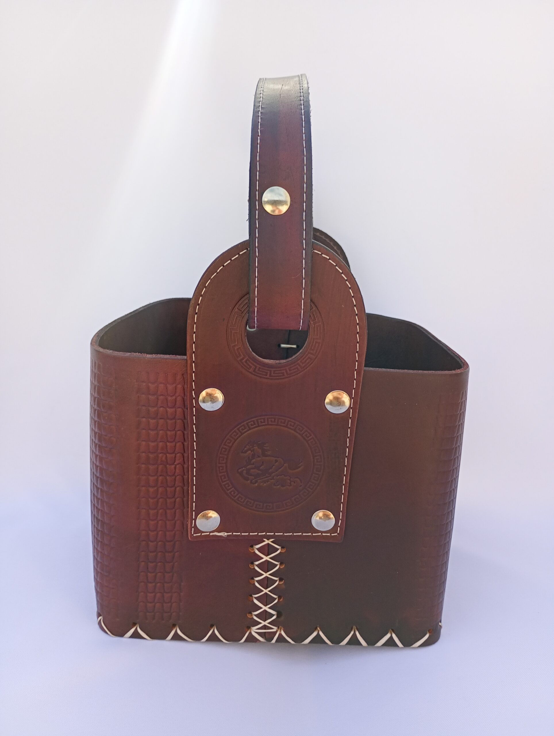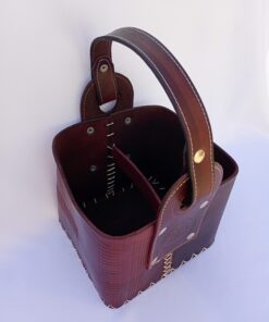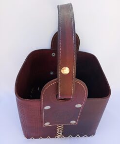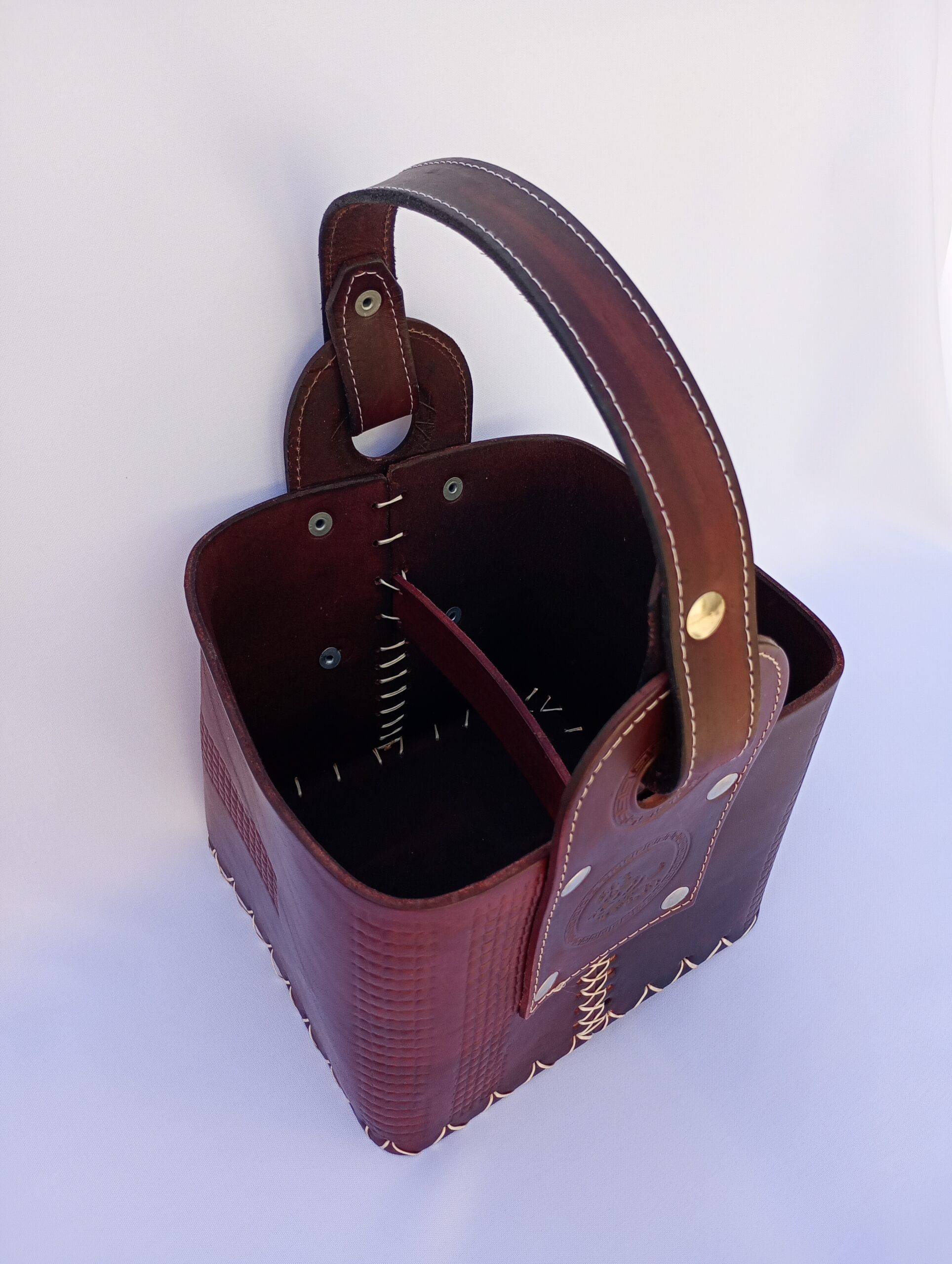 Canasta matera confeccionada 100% en cuero vacuno de alta calidad.