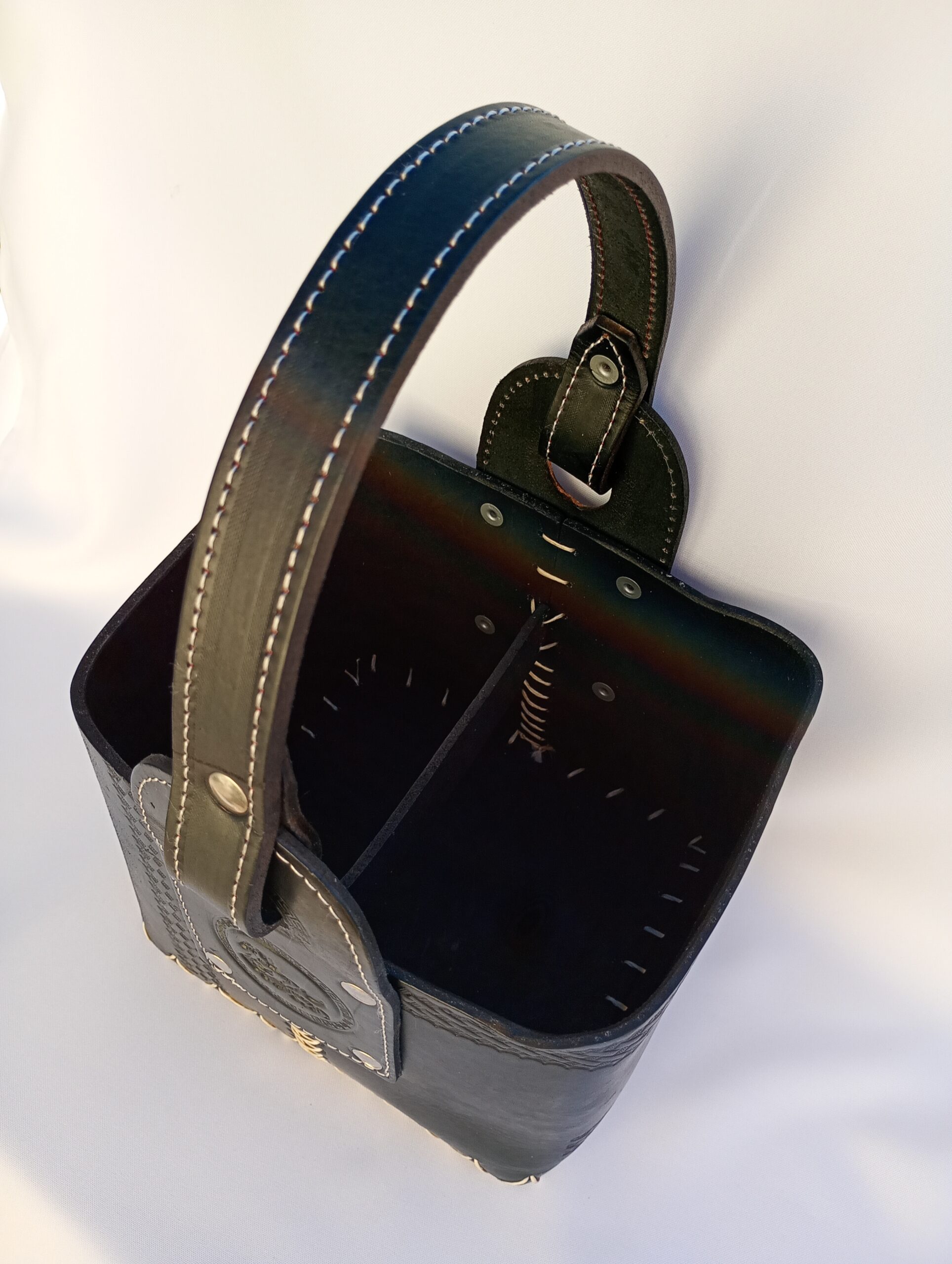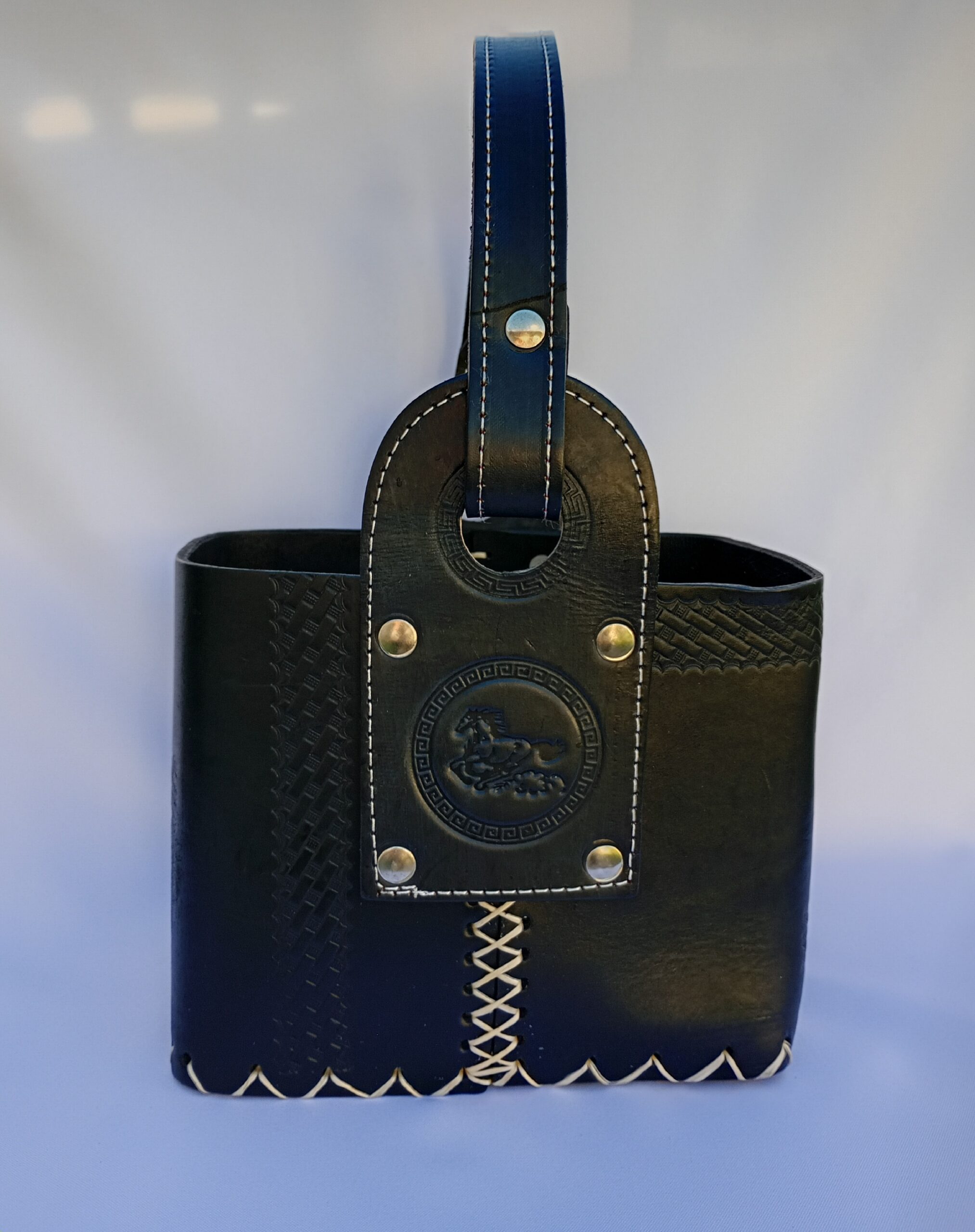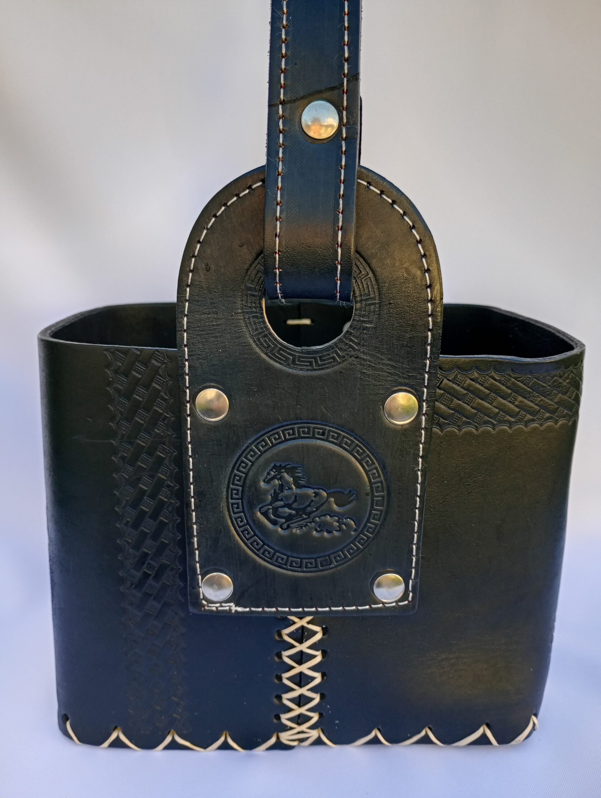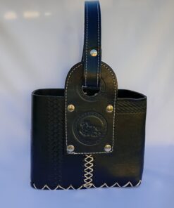 Canasta matera confeccionada 100% en cuero vacuno de alta calidad.